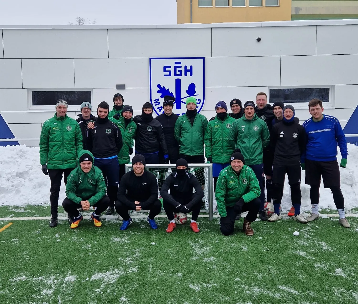 Der Samstag startete dann mit einer etwas ungewöhnlichen Einheit. Der Kunstrasenplatz der SG Handel musste von einer ca. 15cm Schneedecke befreit werden. Mit Schneeschiebern, Schubkarren und Schaufeln wurde dann in knapp zwei Stunden die Trainingsfläche vorbereitet. Danach bat Trainer Weiß zu zwei weiteren Einheiten auf den Platz.